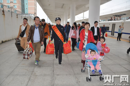央廣網(wǎng)百色1月18日消息(通訊員 李心語 劉英瑛)1月18日15時08分,從廣州南站發(fā)出的D3782次愛心專列,免費載著634名在粵務(wù)工的百色籍同鄉(xiāng)安全返家。 “到了到了!”,百色火車站派出所年輕民警在站臺與車內(nèi)的乘客揮手示意。待列車停穩(wěn),老鄉(xiāng)們拎著行李、抱著孩子蜂擁而下。民警們隨即迎上去,搭手幫忙,一直送到百色市就業(yè)服務(wù)中心安排的2輛公共汽車上。 田陽縣的老陸一家免費乘車返鄉(xiāng),本來就已驚喜萬分,這一下車又是一個驚喜:“沒有想到還有車站民警幫我拿行李,提醒我們注意安全,出站也有民警維持秩序,感覺很貼心、很溫暖”。 據(jù)悉,2017年春運期間,兩廣聯(lián)合開展“精準扶貧滿關(guān)愛,回家路上暖人心”主題活動,送在粵百色籍的貧困務(wù)工人員返鄉(xiāng)過年。 |