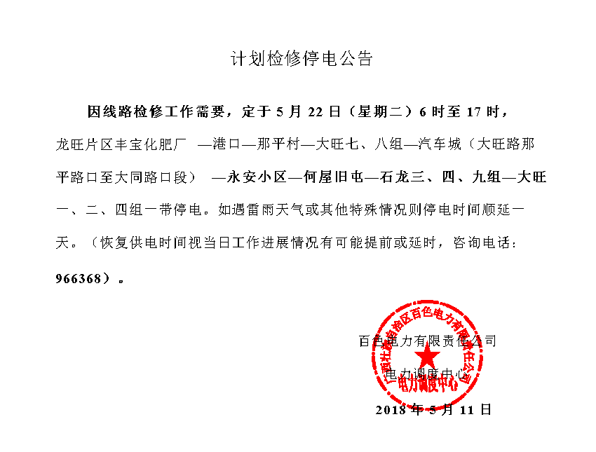 因線路檢修工作需要,定于 5 月 22 日(星期二)6 時(shí)至 17 時(shí),龍旺片區(qū)豐寶化肥廠—港口—那平村—大旺七、八組—汽車城(大旺路那平路口至大同路口段)—永安小區(qū)—何屋舊屯—石龍三、四、九組—大旺一、二、四組一帶停電。如遇雷雨天氣或其他特殊情況則停電時(shí)間順延一天。(恢復(fù)供電時(shí)間視當(dāng)日工作進(jìn)展情況有可能提前或延時(shí),咨詢電話:966368)。 |
