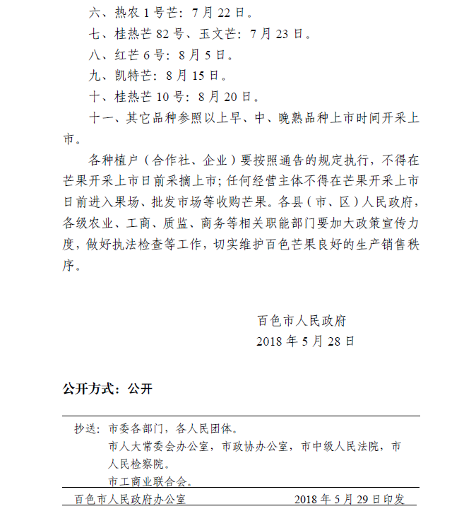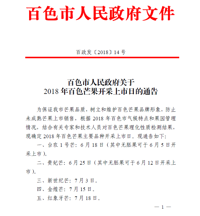 百色市人民政府關(guān)于2018年百色芒果開(kāi)采上市日的通告 為保證我市芒果品質(zhì),樹(shù)立和維護(hù)百色芒果品牌形象,防止未成熟芒果上市銷(xiāo)售,根據(jù)2018年百色市氣候特點(diǎn)和果園管理情況,結(jié)合有關(guān)專(zhuān)家和技術(shù)人員對(duì)百色芒果理化性質(zhì)檢測(cè)結(jié)果,現(xiàn)確定2018年百色芒果主要品種開(kāi)釆上市日,F(xiàn)通告如下: 一、臺(tái)農(nóng)1號(hào)芒:6月18日(其中無(wú)胚果可于6月5曰開(kāi)采上市)。 二、貴妃芒:6月25日(其中無(wú)胚果可于6月12日開(kāi)采上市)。 三、新世紀(jì)芒:7月3日。 四、金煌芒:7月15曰。 五、紅象牙芒:7月18日。 六、熱農(nóng)1號(hào)芒:7月22日。 七、桂熱芒82號(hào)、玉文芒:7月23曰。 八、紅芒6號(hào):8月5日。 九、凱特芒:8月15日。 十、桂熱芒10號(hào):8月20曰。 十一、其它品種參照以上早、中、晚熟品種上市時(shí)間開(kāi)采上市。各種植戶(合作社、企業(yè))要按照通告的規(guī)定執(zhí)行,不得在芒果開(kāi)采上市日前采摘上市;任何經(jīng)營(yíng)主體不得在芒果開(kāi)采上市曰前進(jìn)入果場(chǎng)、批發(fā)市場(chǎng)等收購(gòu)芒果。各縣(市、區(qū))人民政府,各級(jí)農(nóng)業(yè)、工商、質(zhì)監(jiān)、商務(wù)等相關(guān)職能部門(mén)要加大政策宣傳力度,做好執(zhí)法檢查等工作,切實(shí)維護(hù)百色芒果良好的生產(chǎn)銷(xiāo)售秩序。 |