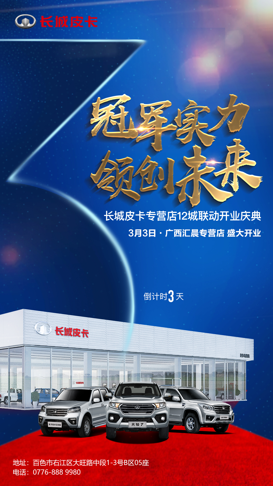 皮卡專屬服務(wù)到來,百色市首家皮卡專營店——廣西匯晨皮卡專營店將于3月3日開業(yè),為皮卡用戶量身打造一站式無憂服務(wù)! 長城皮卡廣西匯晨專營店的開業(yè),一站式解決了皮卡用戶的從選車、購車到用車的需求。皮卡專營店的設(shè)立,為廣大皮卡用戶提供了更便捷、高效、專業(yè)的服務(wù),讓皮卡用戶真正體驗到屬于自己的專屬服務(wù)。另外,專營店還將為用戶提供整車銷售、精品、金融貸款、保險、售后服務(wù)等業(yè)務(wù)于一體的專業(yè)服務(wù),為用戶打造全方位無憂服務(wù)。 此次廣西匯晨皮卡專營店開業(yè),集合風(fēng)駿5歐洲版、經(jīng)典版、新風(fēng)駿6、風(fēng)駿7等多款長城皮卡車型,供不同購車需求的用戶盡情挑選。專營店內(nèi)有專業(yè)銷售人員將為用戶提供全面的車型介紹,讓用戶輕松選擇出最合適自己的長城皮卡車型。 2018年,長城皮卡連續(xù)21年獲得國內(nèi)銷量、出口雙第一,全球累計銷量破150萬量,長城皮卡,實至名歸的國際化皮卡品牌。 據(jù)悉, 3月3日廣西匯晨皮卡專營店開業(yè)當(dāng)天,到店用戶均可享受購車優(yōu)惠(根據(jù)經(jīng)銷商優(yōu)惠活動修改),同時還有精彩節(jié)目和精美茶點。心動不如行動,3月3號廣西匯晨皮卡專營店與你想約,不見不散。 廣西匯晨 長城皮卡專營店 電話:0776-888 9980 地址:百色市右江區(qū)大旺路中段1-3號B區(qū)05座(交安檢測站路口) |