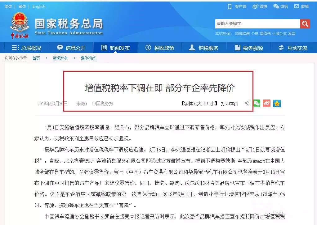 3月5日,政府工作報(bào)告宣布深化增值稅改革,今年將制造業(yè)等行業(yè)現(xiàn)行16%的稅率降至13%,該政策于今年4月1日正式實(shí)施。 近日,國(guó)家稅務(wù)總局官網(wǎng)上公布一則消息:部分品牌汽車(chē)立即通過(guò)下調(diào)零售價(jià)格,率先對(duì)此次減稅作出反應(yīng),減稅政策利企惠民效應(yīng)已初步顯現(xiàn)。 1 增值稅下調(diào)3%,車(chē)企官降 沒(méi)買(mǎi)車(chē)的恭喜了! 3月15日,總理在記者會(huì)上明確提出“4月1日就要減增值稅”。當(dāng)晚,北京梅賽德斯-奔馳銷(xiāo)售服務(wù)有限公司即通過(guò)官方微博宣布,提前下調(diào)梅賽德斯-奔馳及smart在中國(guó)大陸全部在售車(chē)型的廠(chǎng)商建議零售價(jià)。寶馬(中國(guó))汽車(chē)貿(mào)易有限公司和華晨寶馬汽車(chē)有限公司也緊接著于3月16日宣布下調(diào)在中國(guó)銷(xiāo)售的汽車(chē)產(chǎn)品廠(chǎng)家建議零售價(jià)。同日,捷豹、路虎、沃爾沃和林肯等品牌也宣布下調(diào)在華銷(xiāo)售汽車(chē)價(jià)格。這不是車(chē)企響應(yīng)國(guó)家減稅政策的第一次集體行動(dòng)。2018年5月1日,制造業(yè)等行業(yè)增值稅稅率從17%降至16%時(shí),奔馳、捷豹等車(chē)企也在當(dāng)天宣布“官降”。 我們來(lái)看下此次降價(jià)的都有哪些車(chē)子: ![]() 來(lái)源:界面新聞、數(shù)據(jù)線(xiàn) 增值稅下調(diào)三個(gè)點(diǎn),車(chē)價(jià)能降多少?以捷豹XFL精英版為例,調(diào)價(jià)前官方指導(dǎo)價(jià)41.58萬(wàn)元,在非含稅價(jià)不變的情況下,增值稅由16%下調(diào)至13%,則該車(chē)型含稅價(jià)的下調(diào)幅度約為2.59%。 在此次下調(diào)價(jià)格的89款車(chē)型中,超5成(48款)的降價(jià)幅度低于2.59%。另有四成(39款)降價(jià)幅度高于2.59%。 ![]() ![]() 來(lái)源:界面新聞、數(shù)據(jù)線(xiàn) 2 增值稅憑什么影響豪車(chē)價(jià)格? 增值稅,是以商品(含應(yīng)稅勞務(wù))在流轉(zhuǎn)過(guò)程中產(chǎn)生的增值額作為計(jì)稅依據(jù)而征收的一種流轉(zhuǎn)稅。 增值稅是價(jià)外稅,采取稅款抵扣制度,稅款隨著商品流通而轉(zhuǎn)移,會(huì)計(jì)上體現(xiàn)為終端消費(fèi)者承擔(dān)所有稅款。消費(fèi)者在購(gòu)買(mǎi)汽車(chē)時(shí),發(fā)票上寫(xiě)得很清楚,價(jià)格多少,稅多少,價(jià)稅合計(jì)多少,這其中的稅,指的就是增值稅。增值稅稅率下調(diào),可以說(shuō)是直接減輕了消費(fèi)者的負(fù)擔(dān)。 增值稅是中國(guó)最主要的稅種之一,也是最大的稅種。簡(jiǎn)單點(diǎn)理解,買(mǎi)車(chē)時(shí)的官方指導(dǎo)價(jià)就已經(jīng)是包含增值稅的價(jià)格。 明白增值稅的含義后,就能很好解釋最近各大汽車(chē)品牌都官降的緣由了:稅率降低,車(chē)企生產(chǎn)成本隨之下降,汽車(chē)官方指導(dǎo)價(jià)自然也降低。2018年5月1日起,增值稅率已從17%下調(diào)至16%,2019年4月1日起再次下調(diào)至13%。 汽車(chē)行業(yè)是受此次增值稅降稅率政策影響較大的行業(yè),特別是對(duì)售價(jià)高、需求彈性強(qiáng)的豪華品牌汽車(chē)而言,這種影響尤為明顯。所以每逢增值稅稅率降低,車(chē)企的反應(yīng)最大! 經(jīng)過(guò)測(cè)算,增值稅稅率降低3%,10萬(wàn)的車(chē)在理想情況下可以降2500元! 增值稅稅率降低到13%后 減少的稅額為 868207*(16%-13%)=2586! 增值稅降稅率是否會(huì)帶動(dòng)某類(lèi)商品降價(jià),具體會(huì)降價(jià)多少,是由該類(lèi)商品的市場(chǎng)競(jìng)爭(zhēng)程度和相關(guān)企業(yè)品牌影響力決定的。但此次增值稅降稅率無(wú)疑為企業(yè)提供了降價(jià)空間,可以預(yù)計(jì),將會(huì)有更多的企業(yè)、更多的商品加入到降價(jià)的行列中來(lái)。 3 增值稅下調(diào) 對(duì)我們的錢(qián)袋子有什么影響? 其實(shí),增值稅下調(diào)的影響不僅僅是買(mǎi)車(chē),也不僅僅對(duì)企業(yè)有影響,更對(duì)我們生活的很多方面都有影響,很多商品的價(jià)格都將降低。具體的影響:r> ![]() ![]() |