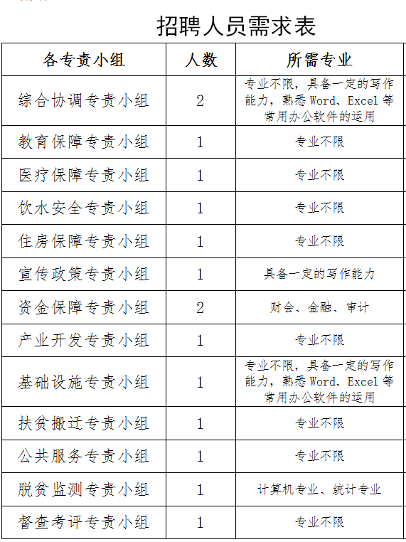百色市脫貧攻堅戰(zhàn)指揮部是百色市委、市人民政府負責協調全市脫貧攻堅工作的專門機構。因工作需要,經市委、市人民政府同意,決定面向社會公開招聘工作人員15名,現將招聘事項公告如下: 一、招聘原則 按照“公平、公正、公開、擇優(yōu)”的原則,堅持德才兼?zhèn)涞臉藴,通過面試、體檢、考核等程序擇優(yōu)確定聘用人員。 二、應聘基本條件 (一)遵守中華人民共和國憲法和法律,品德端正,誠實守信,無任何不良記錄和違法違紀行為; 。ǘ┯蟹险衅嘎毼凰璧膶I(yè)要求,熟練電腦操作,有較好的文字、語言表達能力; (三)身體健康,責任心強,吃苦耐勞,具有奉獻精神,能熱心為群眾服務,有較強溝通能力和一定的組織協調能力; (四)具有全日制普通高等院校畢業(yè)生大學?埔陨蠈W歷,綜合成績優(yōu)良,按期獲得相應學歷學位證書; 。ㄎ澹┠挲g在18周歲以上、32周歲以下(1987年6月30日至2001年6月30日期間出生)。 三、試用期和待遇 試用期3個月,通過試用期后簽訂正式勞動合同。聘用月工資1800元,并按國家有關規(guī)定辦理社會保險等手續(xù),享受國家和自治區(qū)規(guī)定節(jié)假日休假。聘用期滿后根據工作表現,確定續(xù)聘或解聘。 四、報名時間及方式 。ㄒ唬﹫竺麜r間:2019年8月2日—2019年8月16日。 。ǘ﹫竺绞剑簩人簡歷發(fā)到百色市脫貧攻堅戰(zhàn)指揮部綜合協調專責小組郵箱bssfpgj@126.com,或攜帶報名表到百色市脫貧攻堅戰(zhàn)指揮部綜合協調專責小組(百色市東洲大道19號,百色體育中心內)。報名表須有近期免冠照片,并附上最高學歷和學位證書、身份證等掃描件(復印件)及個人近三年成果,經初步審核后通知面試。 咨詢電話:百色市脫貧攻堅戰(zhàn)指揮部綜合協調專責小組 聯系人:羅朝府 聯系電話:0776—2862016 百色市脫貧攻堅戰(zhàn)指揮部 綜合協調專責小組 2019年8月2日 |