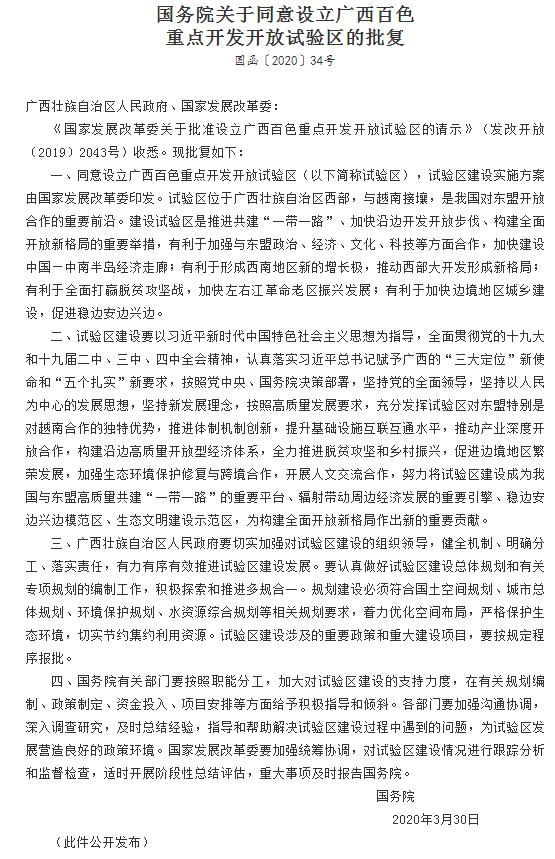 據(jù)中國政府網(wǎng)4月7日消息,國務院發(fā)布關(guān)于同意設立廣西百色重點開發(fā)開放試驗區(qū)的批復。批復指出,要努力將試驗區(qū)建設成為我國與東盟高質(zhì)量共建“一帶一路”的重要平臺、輻射帶動周邊經(jīng)濟發(fā)展的重要引擎、穩(wěn)邊安邊興邊模范區(qū)、生態(tài)文明建設示范區(qū),為構(gòu)建全面開放新格局作出新的重要貢獻。