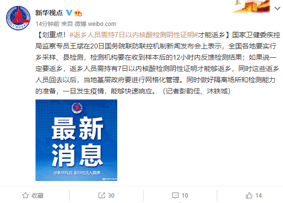 1月20日,來自國家衛(wèi)健委網(wǎng)站的消息顯示,國務(wù)院應(yīng)對新型冠狀病毒肺炎疫情聯(lián)防聯(lián)控機制綜合組和中央農(nóng)村工作領(lǐng)導(dǎo)小組辦公室制定了《冬春季農(nóng)村地區(qū)新冠肺炎疫情防控工作方案》。 《方案》特別指出,要加強返鄉(xiāng)人員管理。全國各地要實行鄉(xiāng)采樣、縣檢測,檢測機構(gòu)要在收到樣本后的12小時內(nèi)反饋檢測結(jié)果。 如果外出人員一定要返鄉(xiāng),需持有7日以內(nèi)核酸檢測陰性證明。 返鄉(xiāng)后,當(dāng)?shù)鼗鶎诱M行網(wǎng)格化管理,實行14天居家健康監(jiān)測,期間不聚集、不流動,每7天開展一次核酸檢測。 中國疾控中心副主任馮子健也強調(diào),低風(fēng)險地區(qū)倡導(dǎo)在家就餐,盡量減少外出聚餐,必須外出就餐時要佩戴口罩、攜帶手消毒劑,就餐時間不要超過2個小時,就餐結(jié)束后建議選擇掃碼付款等無接觸付款付費方式。 |