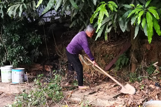 每天早上謝月娥都起來掃地、掃門口、掃公路。“我覺得掃了舒服,走過去舒服,干凈。如果個(gè)個(gè)都這么做,搞得干凈就好了!敝x月娥說。