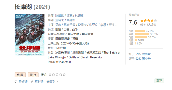 | 今年國(guó)慶檔電影中,吳京主演的戰(zhàn)爭(zhēng)大片《長(zhǎng)津湖》票房已經(jīng)領(lǐng)跑,上映不到2天時(shí)間票房超過了6億,并打破了中國(guó)影史11項(xiàng)記錄。 作為中國(guó)電影史上制作規(guī)模最大、參與人數(shù)最多的電影,《長(zhǎng)津湖》以一部大片的擔(dān)綱掀起國(guó)慶檔的觀影熱潮。 截至10月1日20時(shí)35分,在《長(zhǎng)津湖》《我和我的父輩》等頭部影片的帶動(dòng)下,國(guó)慶檔首日票房已突破6億元,暫列國(guó)慶檔首日票房影史第三。 電影《長(zhǎng)津湖》不到2天時(shí)間票房累計(jì)突破6億元,創(chuàng)中國(guó)影史單日票房等11項(xiàng)影史紀(jì)錄,目前豆瓣開分7.6分。 《長(zhǎng)津湖》在國(guó)慶首日3.89億的票房也超越了2020年國(guó)慶單日冠軍《姜子牙》的3.63億,和2019年同期《我和我的祖國(guó)》3.88億的成績(jī),成為中國(guó)電影史國(guó)慶檔影片單日票房的冠軍。 《長(zhǎng)津湖》由陳凱歌、林超賢、徐克執(zhí)導(dǎo),吳京、易烊千璽領(lǐng)銜主演,段奕宏特別主演,朱亞文、李晨、韓東君主演,胡軍特邀主演,張涵予友情主演。 影片以長(zhǎng)津湖戰(zhàn)役為背景,講述了一個(gè)志愿軍連隊(duì)在極度嚴(yán)酷環(huán)境下堅(jiān)守陣地奮勇殺敵,為長(zhǎng)津湖戰(zhàn)役勝利作出重要貢獻(xiàn)的感人故事。 |