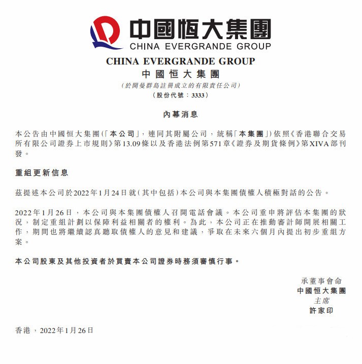 1月26日消息,今日晚間,中國(guó)恒大在港交所公告,公司與集團(tuán)債權(quán)人召開電話會(huì)議。公司重申將評(píng)估集團(tuán)的狀況,制定重組計(jì)劃以保障利益相關(guān)者的權(quán)利。 為此,公司正在推動(dòng)審計(jì)師開展相關(guān)工作,期間也將繼續(xù)認(rèn)真聽取債權(quán)人的意見和建議,爭(zhēng)取在未來六個(gè)月內(nèi)提出初步重組方案。 電話會(huì)議上,中國(guó)恒大執(zhí)行董事肖恩表示,中國(guó)恒大董事會(huì)及風(fēng)險(xiǎn)化解委員會(huì)及管理團(tuán)隊(duì),正共同制定全面、細(xì)致、有效的計(jì)劃,研究各種潛在方案,計(jì)劃于未來6個(gè)月內(nèi)推出初步重組方案。 據(jù)界面新聞消息,恒大高管指出,為應(yīng)對(duì)當(dāng)前的運(yùn)營(yíng)挑戰(zhàn),2021年12月6日設(shè)立風(fēng)險(xiǎn)化解委員會(huì),成員包括公司高管、相關(guān)單位的高管和專業(yè)人士,可以充分調(diào)用資源。同時(shí),會(huì)借助于專業(yè)人士的意見和國(guó)際經(jīng)驗(yàn),公平對(duì)待各類投資人。 值得一提的是,1月1日,許家印在給恒大全體員工的新年致辭中透露,目前恒大全國(guó)項(xiàng)目復(fù)工率已達(dá)91.7%,復(fù)工人數(shù)8.9萬(wàn)人,四季度累計(jì)交樓超過5.3萬(wàn)套。 他還表示恒大要永不放棄,毫不動(dòng)搖地把保交樓進(jìn)行到底,要恢復(fù)銷售、恢復(fù)經(jīng)營(yíng)、還清各方面的債務(wù),創(chuàng)造一個(gè)涅槃重生的美好未來。 |