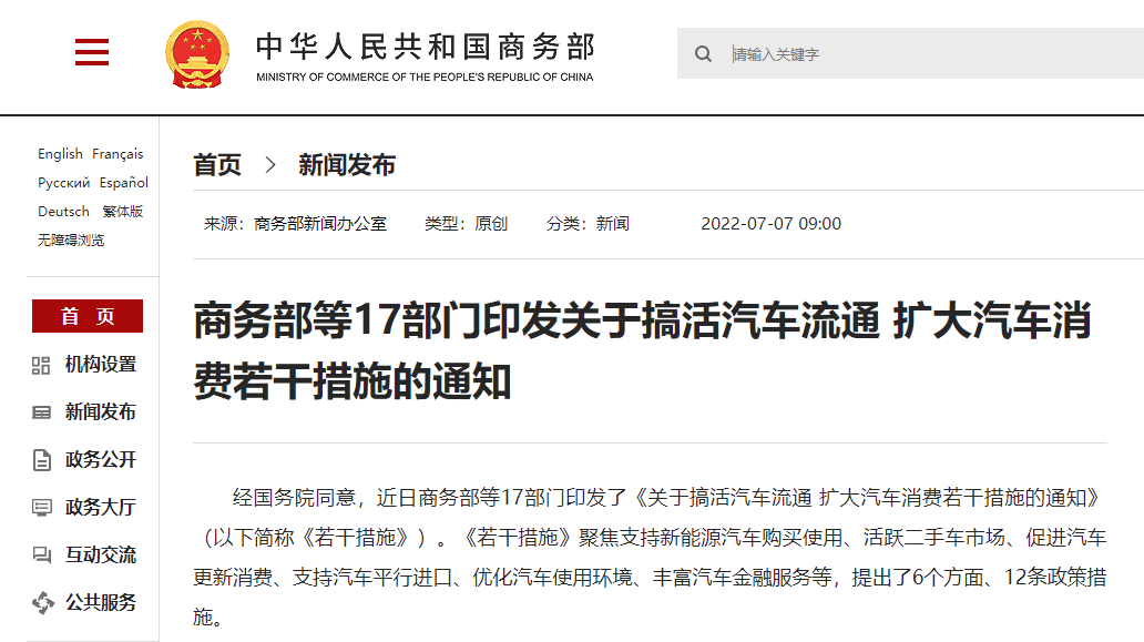 7月7日上午,國務(wù)院新聞辦公室舉行國務(wù)院政策例行吹風(fēng)會,商務(wù)部副部長盛秋平和工業(yè)和信息化部、住房城鄉(xiāng)建設(shè)部有關(guān)負(fù)責(zé)人介紹穩(wěn)定增加汽車消費有關(guān)工作,并答記者問。 商務(wù)部副部長盛秋平在國新辦新聞發(fā)布會上表示,經(jīng)國務(wù)院同意,商務(wù)部會同16部門出臺搞活汽車流通、擴大汽車消費的政策措施: 一是對國務(wù)院《扎實穩(wěn)住經(jīng)濟的一攬子政策措施》中穩(wěn)定增加汽車消費相關(guān)政策措施的細(xì)化落實。 二是針對新能源汽車市場存在地方保護、車輛充電不夠便利,二手車市場“小散弱”、交易登記有待優(yōu)化等問題,提出更多針對性強、務(wù)實管用的有力舉措,力求通過政策靠前發(fā)力、適當(dāng)加力,進一步促進汽車市場潛力釋放。 隨著疫情得到有效控制和各項政策措施發(fā)力見效,汽車消費將持續(xù)回穩(wěn)復(fù)蘇,下半年汽車消費有望實現(xiàn)較快增長,為穩(wěn)定宏觀經(jīng)濟大盤發(fā)揮積極作用。 17部門發(fā)文促進汽車消費 近日商務(wù)部等17部門印發(fā)了《關(guān)于搞活汽車流通 擴大汽車消費若干措施的通知》。聚焦支持新能源汽車購買使用、活躍二手車市場、促進汽車更新消費、支持汽車平行進口、優(yōu)化汽車使用環(huán)境、豐富汽車金融服務(wù)等。 支持新能源汽車消費 研究免征新能源汽車車輛購置稅政策到期后延期問題 《通知》提出,促進跨區(qū)域自由流通,破除新能源汽車市場地方保護,各地區(qū)不得設(shè)定本地新能源汽車車型備案目錄,不得對新能源汽車產(chǎn)品銷售及消費補貼設(shè)定不合理車輛參數(shù)指標(biāo)。 支持新能源汽車消費,研究免征新能源汽車車輛購置稅政策到期后延期問題。深入開展新能源汽車下鄉(xiāng)活動,鼓勵有條件的地方出臺下鄉(xiāng)支持政策,引導(dǎo)企業(yè)加大活動優(yōu)惠力度,促進農(nóng)村地區(qū)新能源汽車消費使用。 加快推進居住社區(qū)、停車場、加油站、高速公路服務(wù)區(qū)等充電設(shè)施建設(shè) 《通知》還提出,積極支持充電設(shè)施建設(shè),加快推進居住社區(qū)、停車場、加油站、高速公路服務(wù)區(qū)、客貨運樞紐等充電設(shè)施建設(shè),引導(dǎo)充電樁運營企業(yè)適當(dāng)下調(diào)充電服務(wù)費。 取消對開展二手車經(jīng)銷的不合理限制 支持汽車整車進口口岸地區(qū)開展汽車平行進口業(yè)務(wù),經(jīng)省級人民政府批準(zhǔn)汽車平行進口工作方案并報商務(wù)部備案,汽車整車進口口岸即可開展汽車平行進口業(yè)務(wù)。完善平行進口汽車強制性產(chǎn)品認(rèn)證和信息公開制度,允許企業(yè)對進口車型持續(xù)符合國六排放標(biāo)準(zhǔn)作出承諾,在環(huán)保信息公開環(huán)節(jié),延續(xù)執(zhí)行對平行進口汽車車載診斷系統(tǒng)(OBD)試驗和數(shù)據(jù)信息的有關(guān)政策要求。 鼓勵各地綜合運用經(jīng)濟、技術(shù)等手段推動老舊車輛退出 加快老舊車輛淘汰更新 鼓勵各地綜合運用經(jīng)濟、技術(shù)等手段推動老舊車輛退出,有條件的地區(qū)可以開展汽車以舊換新,加快老舊車輛淘汰更新。完善報廢機動車回收利用體系,支持符合條件的企業(yè)獲得報廢機動車回收資質(zhì)。對《報廢機動車回收管理辦法實施細(xì)則》施行前已取得資質(zhì)的企業(yè),如因新冠肺炎疫情影響無法按期重新完成資質(zhì)認(rèn)定的,可延期到2023年3月1日。 加大對報廢機動車回收企業(yè)建設(shè)項目用地支持力度,企業(yè)建設(shè)項目用地性質(zhì)原則上應(yīng)為工業(yè)用地,對已取得報廢機動車回收資質(zhì)的企業(yè)及本文件印發(fā)后3個月內(nèi)獲得用地審批或建設(shè)工程規(guī)劃許可的在建項目,按已確定的用途使用土地。 加大汽車消費信貸支持 《通知》提出,鼓勵金融機構(gòu)在依法合規(guī)、風(fēng)險可控的前提下,合理確定首付比例、貸款利率、還款期限,加大汽車消費信貸支持。有序發(fā)展汽車融資租賃,鼓勵汽車生產(chǎn)企業(yè)、銷售企業(yè)與融資租賃企業(yè)加強合作,增加金融服務(wù)供給。 商務(wù)部等17部門關(guān)于搞活汽車流通 擴大汽車消費若干措施的通知 商消費發(fā)〔2022〕92號 各省、自治區(qū)、直轄市人民政府,新疆生產(chǎn)建設(shè)兵團: 汽車業(yè)是國民經(jīng)濟的戰(zhàn)略性、支柱性產(chǎn)業(yè)。為進一步搞活汽車流通,擴大汽車消費,助力穩(wěn)定經(jīng)濟基本盤和保障改善民生,經(jīng)國務(wù)院同意,現(xiàn)將有關(guān)事項通知如下: 一、支持新能源汽車購買使用 (一)促進跨區(qū)域自由流通,破除新能源汽車市場地方保護,各地區(qū)不得設(shè)定本地新能源汽車車型備案目錄,不得對新能源汽車產(chǎn)品銷售及消費補貼設(shè)定不合理車輛參數(shù)指標(biāo)。 (二)支持新能源汽車消費,研究免征新能源汽車車輛購置稅政策到期后延期問題。深入開展新能源汽車下鄉(xiāng)活動,鼓勵有條件的地方出臺下鄉(xiāng)支持政策,引導(dǎo)企業(yè)加大活動優(yōu)惠力度,促進農(nóng)村地區(qū)新能源汽車消費使用。 (三)積極支持充電設(shè)施建設(shè),加快推進居住社區(qū)、停車場、加油站、高速公路服務(wù)區(qū)、客貨運