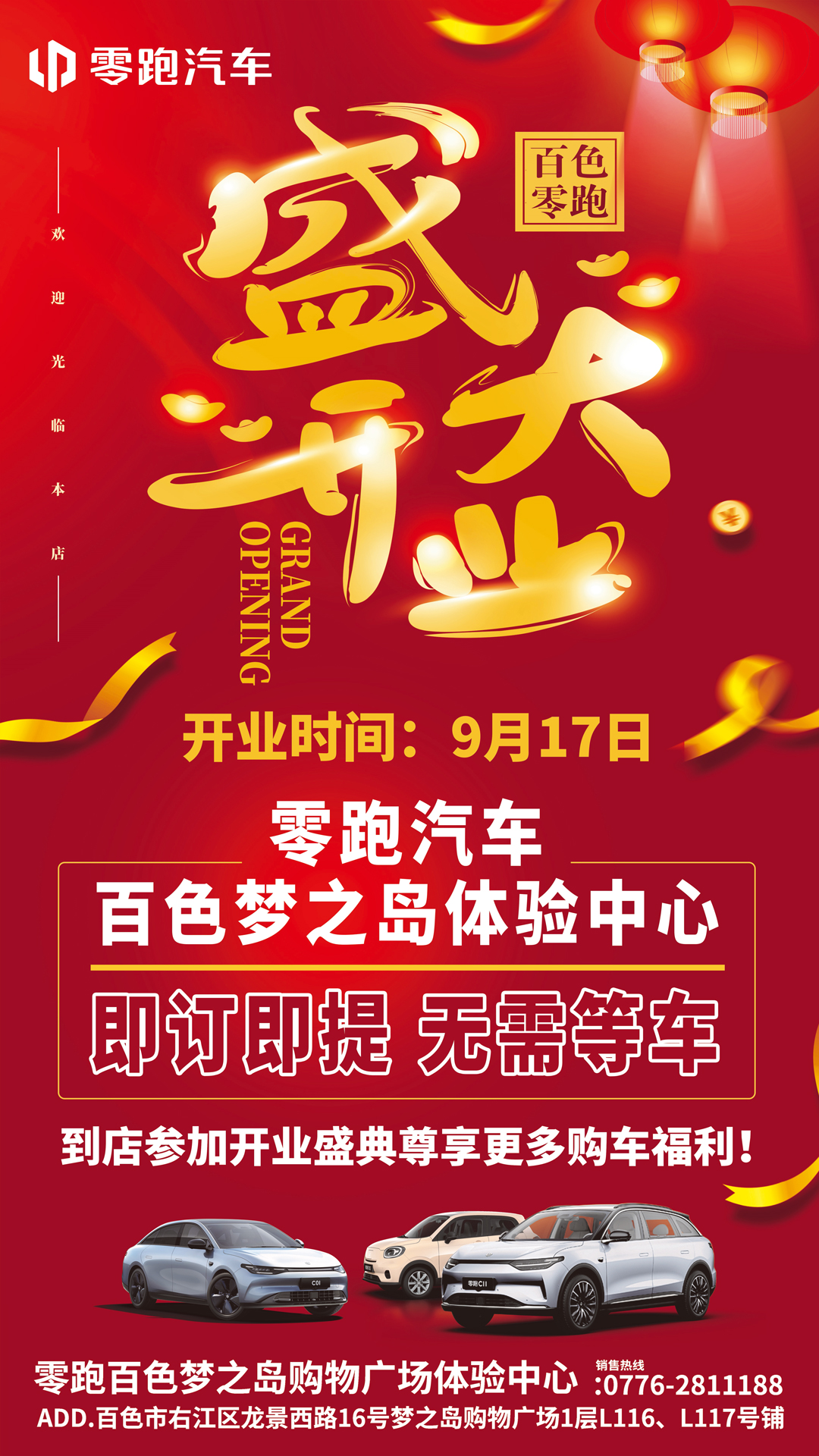 零跑品牌進(jìn)駐百色夢之島商場 9月17日盛大開業(yè) 既訂即提,無需等車! 現(xiàn)本店有試乘試駕體驗(yàn)車 可以線上預(yù)約上門體驗(yàn),歡迎蒞臨賞車購車 T03,首付9900,日供低至48元 本月下定零跑T03可享3重好禮: 1、終身免費(fèi)三電質(zhì)保。 2、終身免費(fèi)道路救援。 3、終身免費(fèi)維保取送車。 C11,0利息,日供低至16元。 本月下定零跑C11可享: 1、至高6000金融補(bǔ)貼。 2、16年50萬公里三電質(zhì)保。 開業(yè)當(dāng)天到店參加開業(yè)盛典尊享更多購車福利! 零跑汽車百色夢之島店 零跑百色夢之島購物廣場體驗(yàn)中心 地址:百色市右江區(qū)龍景西路16號夢之島購物廣場1層L116-L117號商鋪 銷售熱線:0776-2811188 |