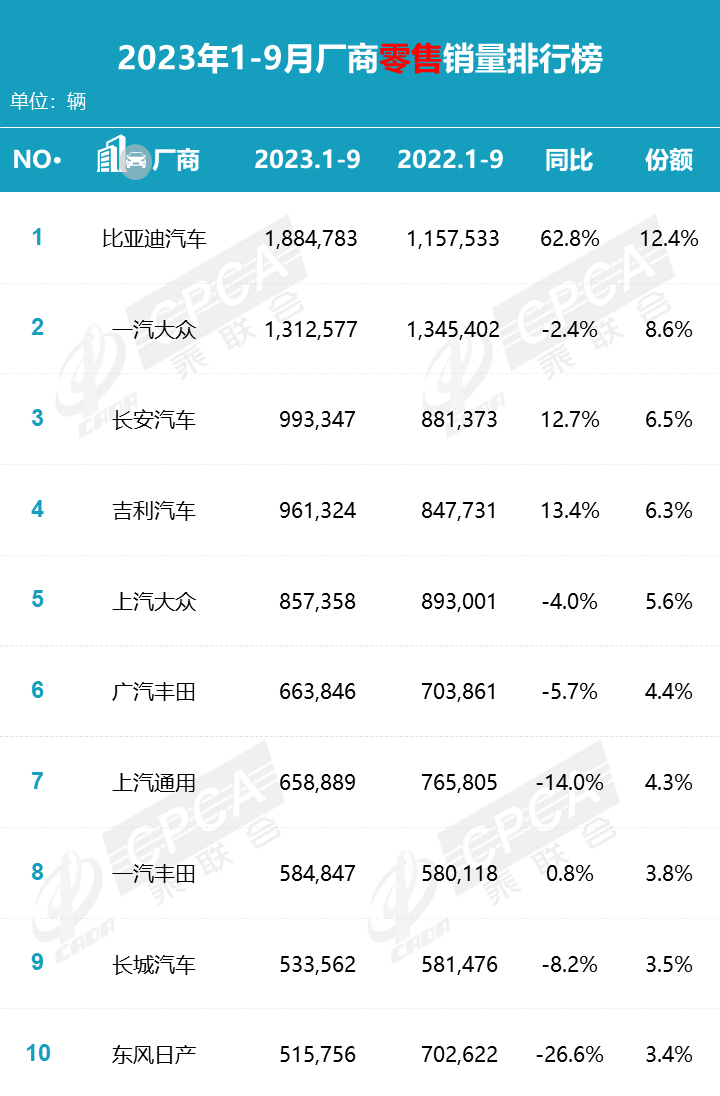 快科技10月12日消息,今天乘聯(lián)會公布了2023年9月零售銷量排名快報(bào)。 最新零售銷量數(shù)據(jù)統(tǒng)計(jì),9月份國內(nèi)狹義乘用車市場零售銷量達(dá)201.8萬輛,同比增長5.0%,環(huán)比增長5.0%;1-9月份累計(jì)銷量1523.3萬輛,同比增長2.4%。 今年前9個(gè)月,中國市場汽車廠商零售銷量排行榜TOP10為:比亞迪、一汽大眾、長安、吉利、上汽大眾、廣汽豐田、上汽通用、一汽豐田、長城、東風(fēng)日產(chǎn)。 今年汽車廠商零售銷量排名TOP 10出爐:比亞迪這數(shù)據(jù)遙遙領(lǐng)先 其中,比亞迪以188.5萬輛遙遙領(lǐng)先,比第二名一汽大眾(131.3萬輛)銷量高出44%。 而且比亞迪不僅銷量最高,增幅也是TOP10中最高的,同比增長62.8%。 在2023年1-9月新能源廠商零售排行榜中,比亞迪也是遙遙領(lǐng)先,市場份額高達(dá)36.3%。 |