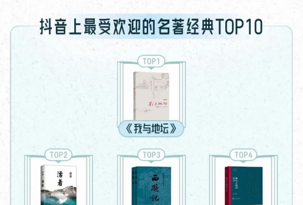根據(jù)名著經(jīng)典書評類相關(guān)視頻累計(jì)播放量排序,抖音上最受歡迎的名著經(jīng)典TOP10如下:《我與地壇》《活著》《西游記》《額爾古納河右岸》《紅樓夢》《平凡的世界》《史記》《水滸傳》《三體》《孫子兵法》。