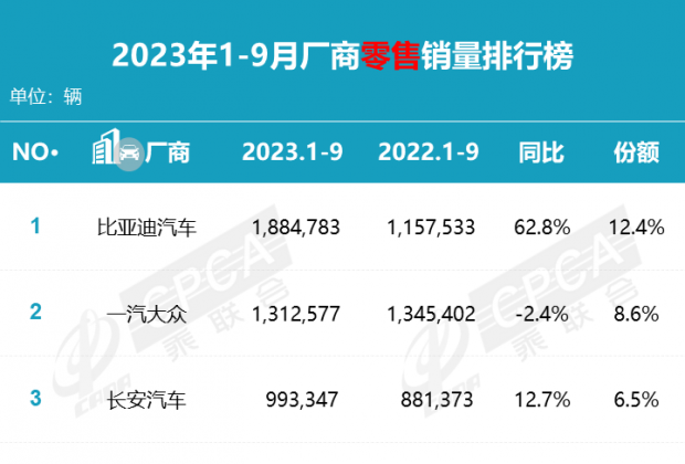 今年前9個月,中國市場汽車廠商零售銷量排行榜TOP10為:比亞迪、一汽大眾、長安、吉利、上汽大眾、廣汽豐田、上汽通用、一汽豐田、長城、東風(fēng)日產(chǎn)。
